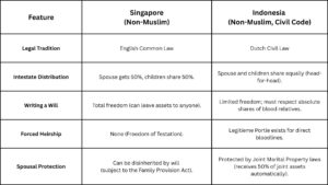 While both Singapore and Indonesia accommodate their diverse populations through separate legal frameworks for Muslims and non-Muslims, their secular laws diverge greatly. Singapore prioritizes the individual’s right to distribute their wealth as they see fit, reflecting its Common Law heritage. In contrast, Indonesia’s Civil Code prioritizes the preservation of bloodlines, legally forcing individuals to leave a portion of their wealth to direct descendants regardless of their personal wishes.