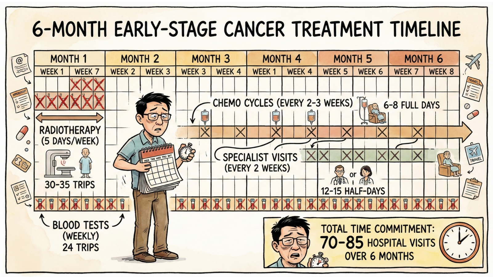 Here’s what a typical early-stage cancer treatment schedule looks like in Singapore’s public healthcare system: