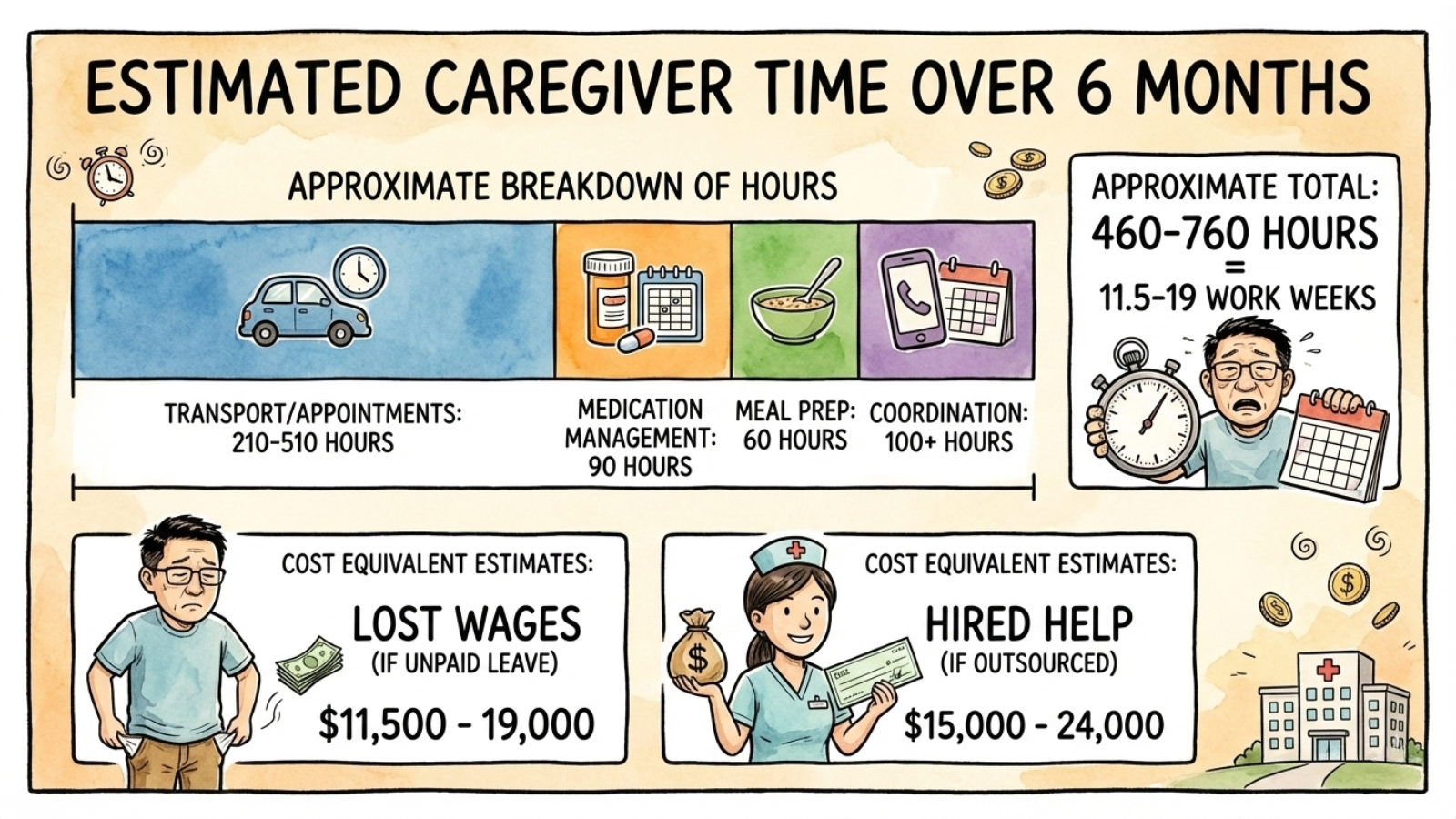 Note: These are illustrative estimates. Actual caregiver time varies significantly based on patient needs, family support availability, and treatment intensity.