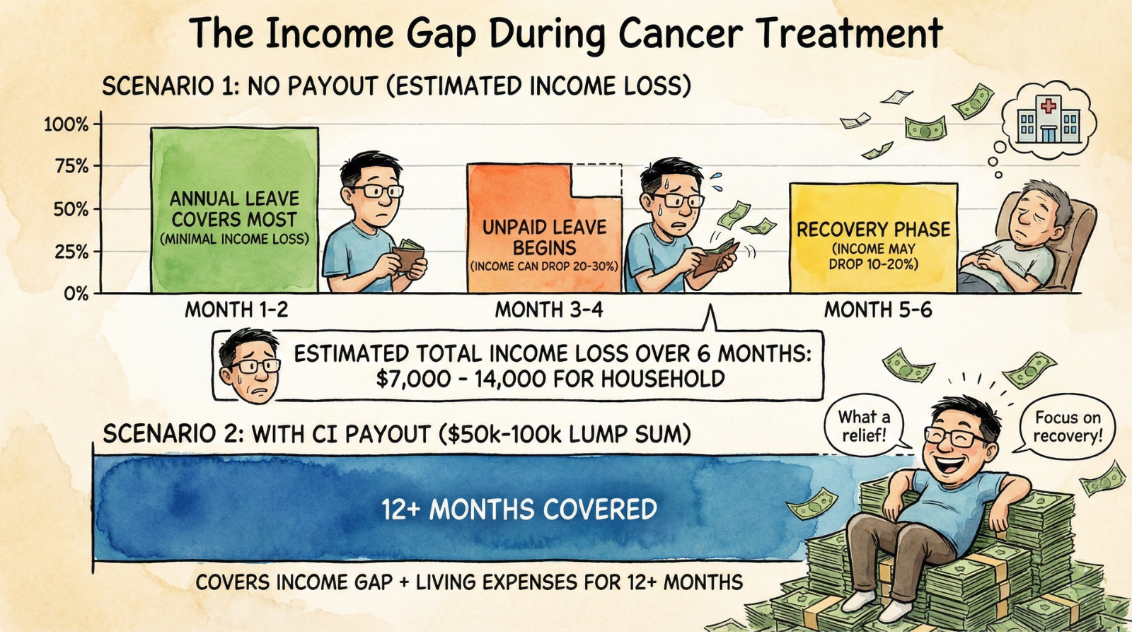 Industry recommendation: The Life Insurance Association (LIA) Singapore recommends obtaining critical illness protection equivalent to 4 times your annual income to provide essential financial support for household expenses during the recovery period.