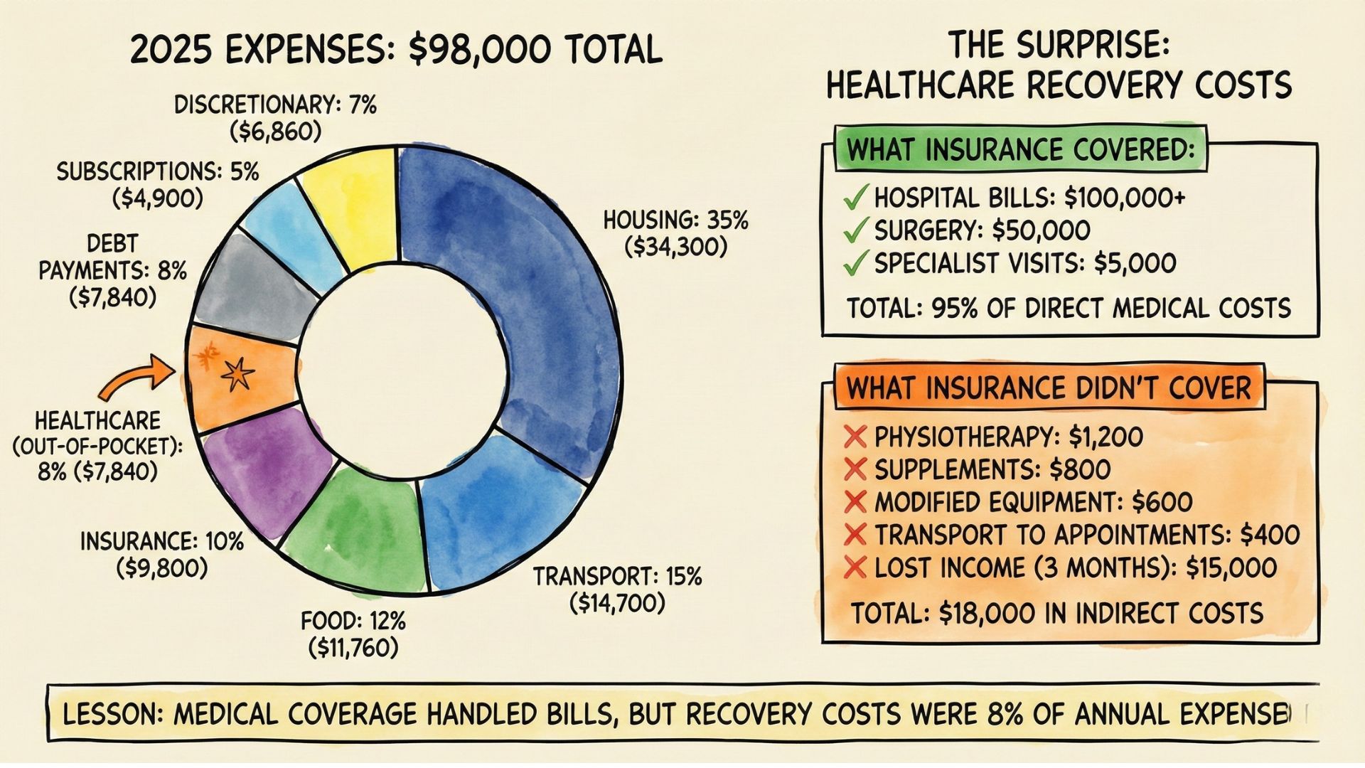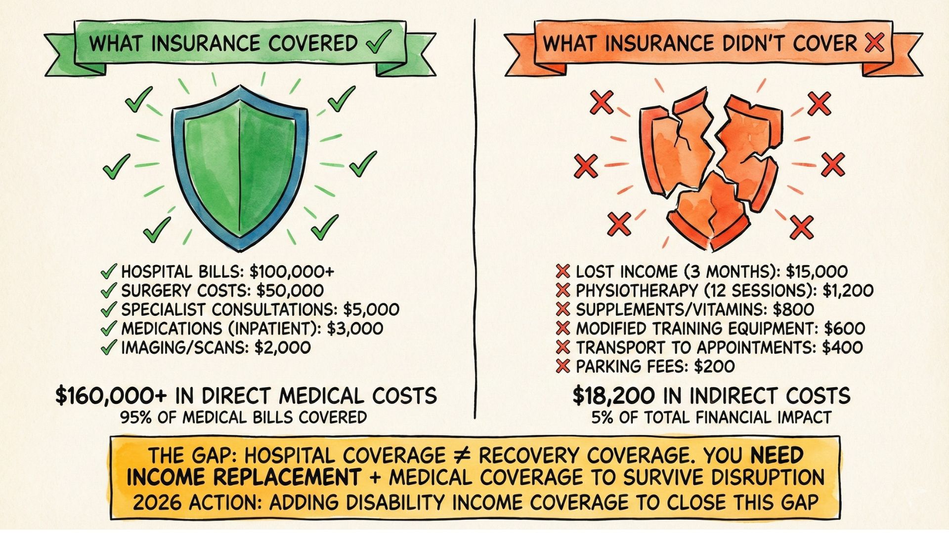 Example from my year: Hospital costs were covered by insurance. But recovery costs weren’t. Physiotherapy, supplements, modified training equipment—those added up to $3,000 over three months. None of that was in my budget. Now I know: medical coverage isn’t just about hospital bills.