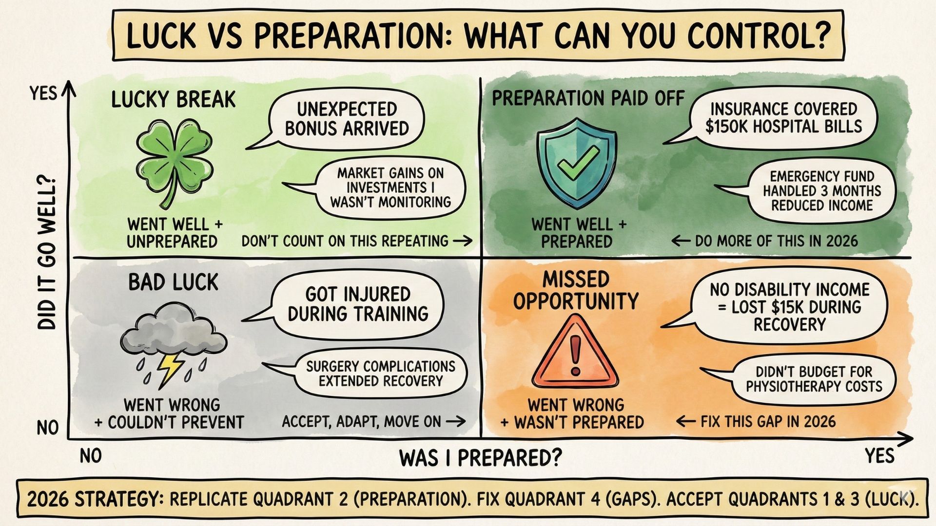 Example from my year: My hospital stays didn’t bankrupt me because I had coverage. That wasn’t luck. That was preparation from years ago when I set up my insurance properly. But my recovery was faster than expected because I’d maintained fitness before the injury. That was half preparation (I trained consistently), half luck (my body healed well).