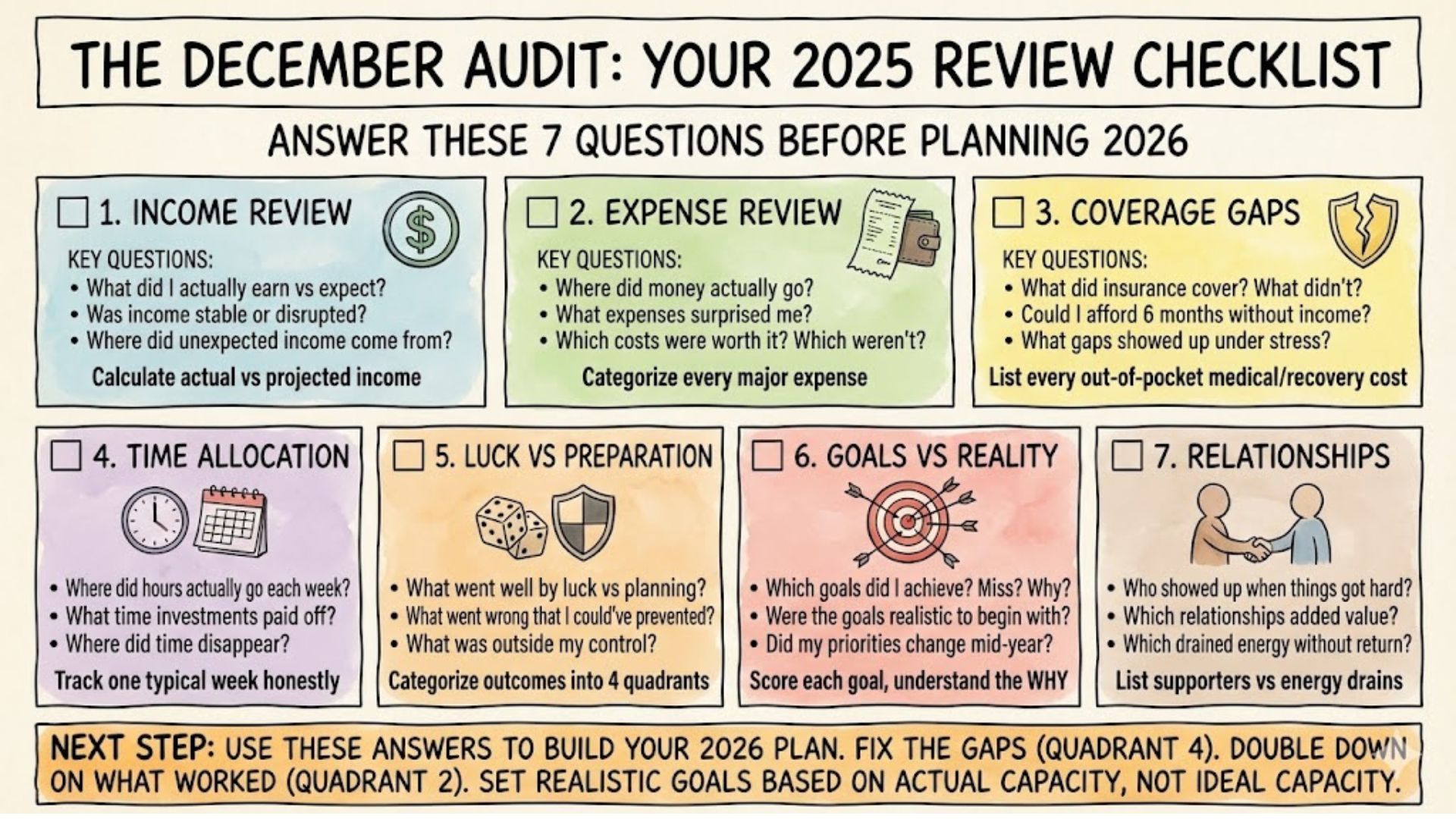 Example from my year: I wanted to hit specific income targets. I missed them because I couldn’t work at full capacity for three months. But I also realized the income target was arbitrary. What I actually needed was income stability and liquidity during disruptions. That’s a different goal.