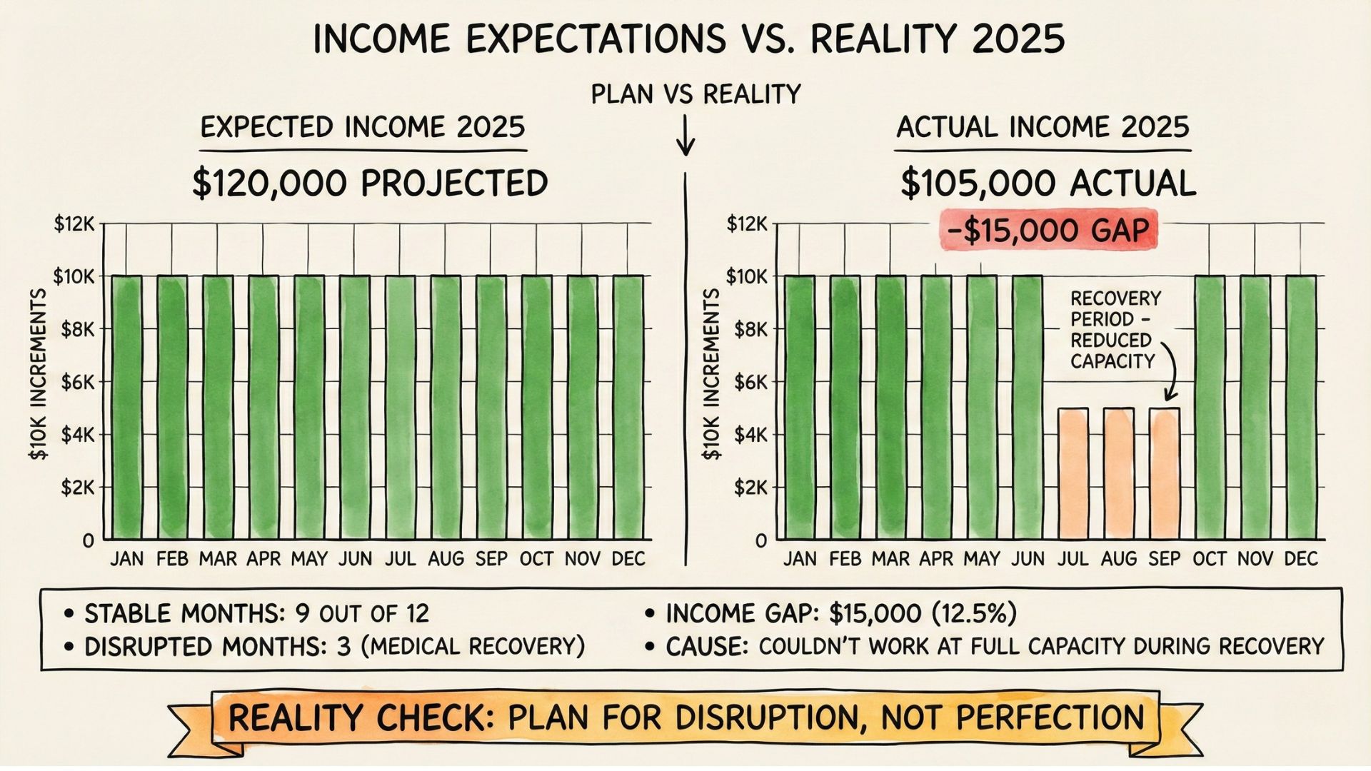 Example from my year: I expected stable income all year. Two surgeries meant three months of reduced capacity. My income dropped during recovery. That wasn’t in the plan. Now I know: I need a bigger emergency fund to cover months when I can’t work at full capacity.