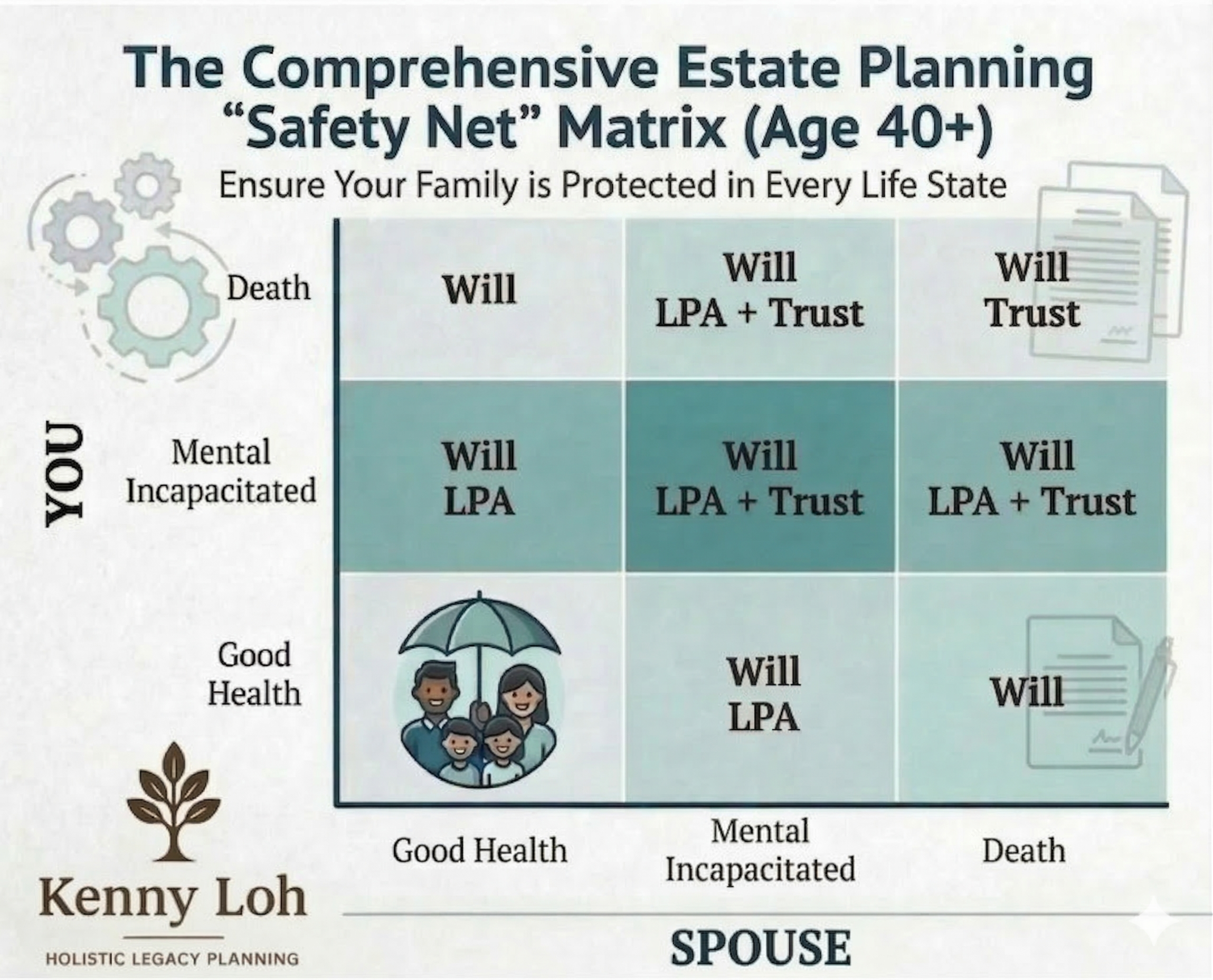 Structured Solution: This requires a robust structure. “Me” has an active LPA with backup donees. “Spouse” had a Will & Testamentary Trust, providing managed income to support “Me” and their children, overseen by reliable Trustees.