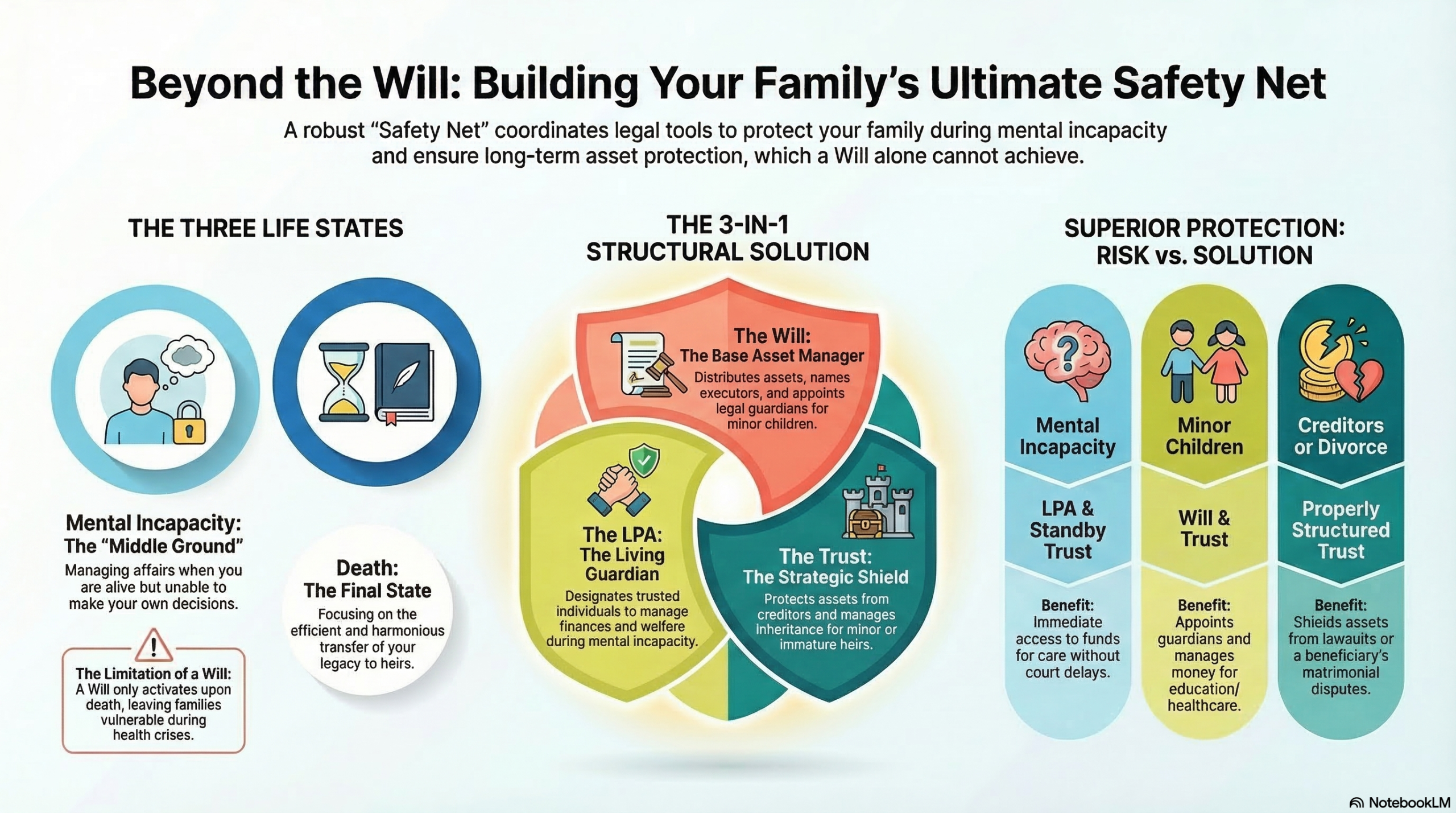 Structured Solution: My Will activates. CPF and Insurance pay out directly to nominees. Jointly held property passes to the spouse. If I have young children, guardians are appointed via the Will, and assets might flow into a Testamentary Trust for their managed support.