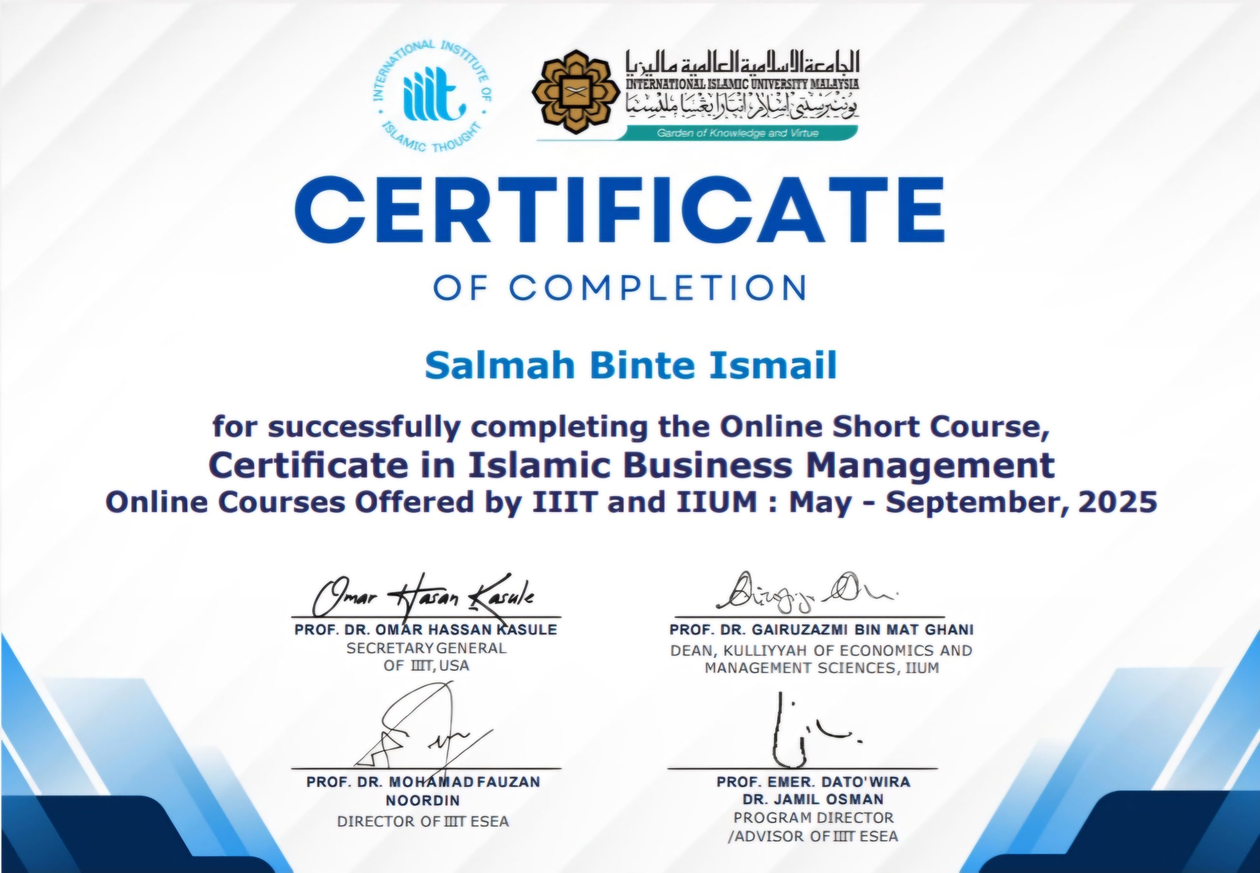 I am a proud mother of three independent daughters and a lifelong learner. Most recently, I completed a course in Islamic Business Management jointly offered by IIIT and IIUM. Over the years, I’ve come to define success as living with integrity, doing things right with kindness, and empowering others to do the same.
